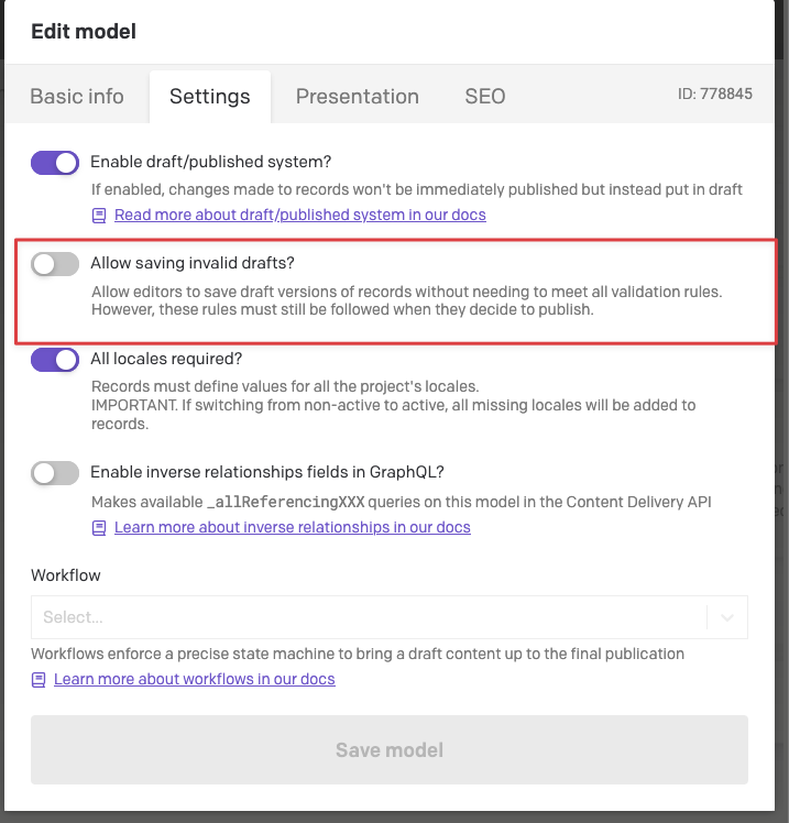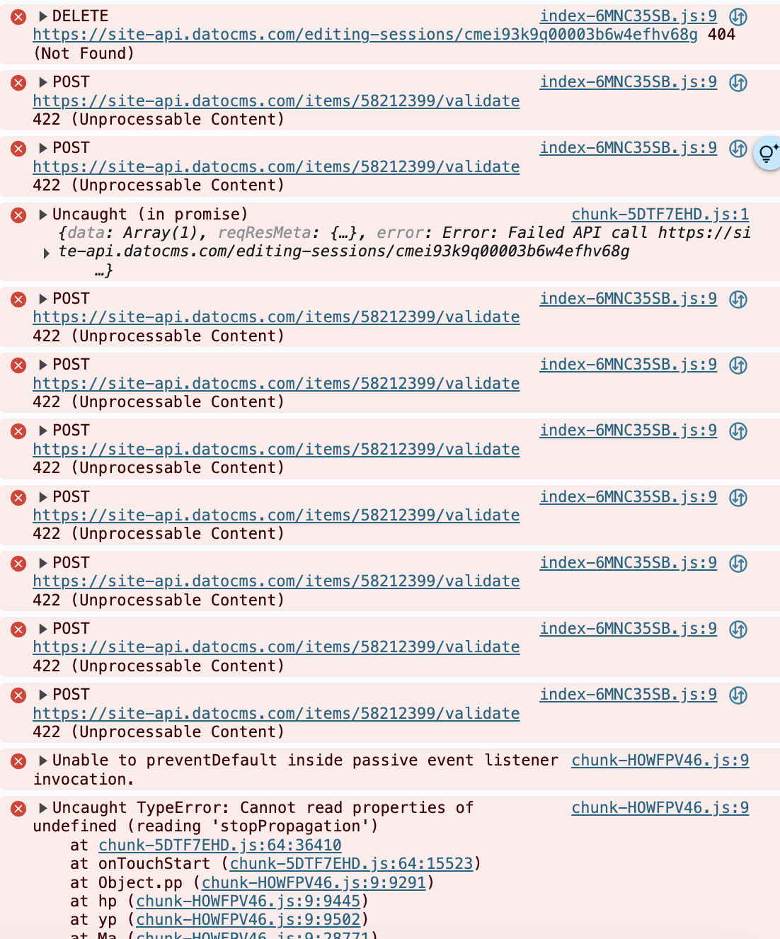I think that happens when you try to save an invalid record (usually because it’s failing validation somewhere). If you edit the model settings to allow saving invalid drafts, it might be easier to work with: