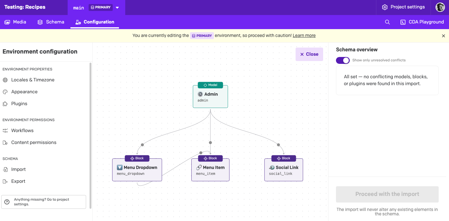 But then ⦠thereās nothing to do. I takes me to the āConfigurationā tab, with a pretty picture of a schema, says there are no unresolved conflicts, but the āProceed with Importā button is grayed out. What am I missing here?