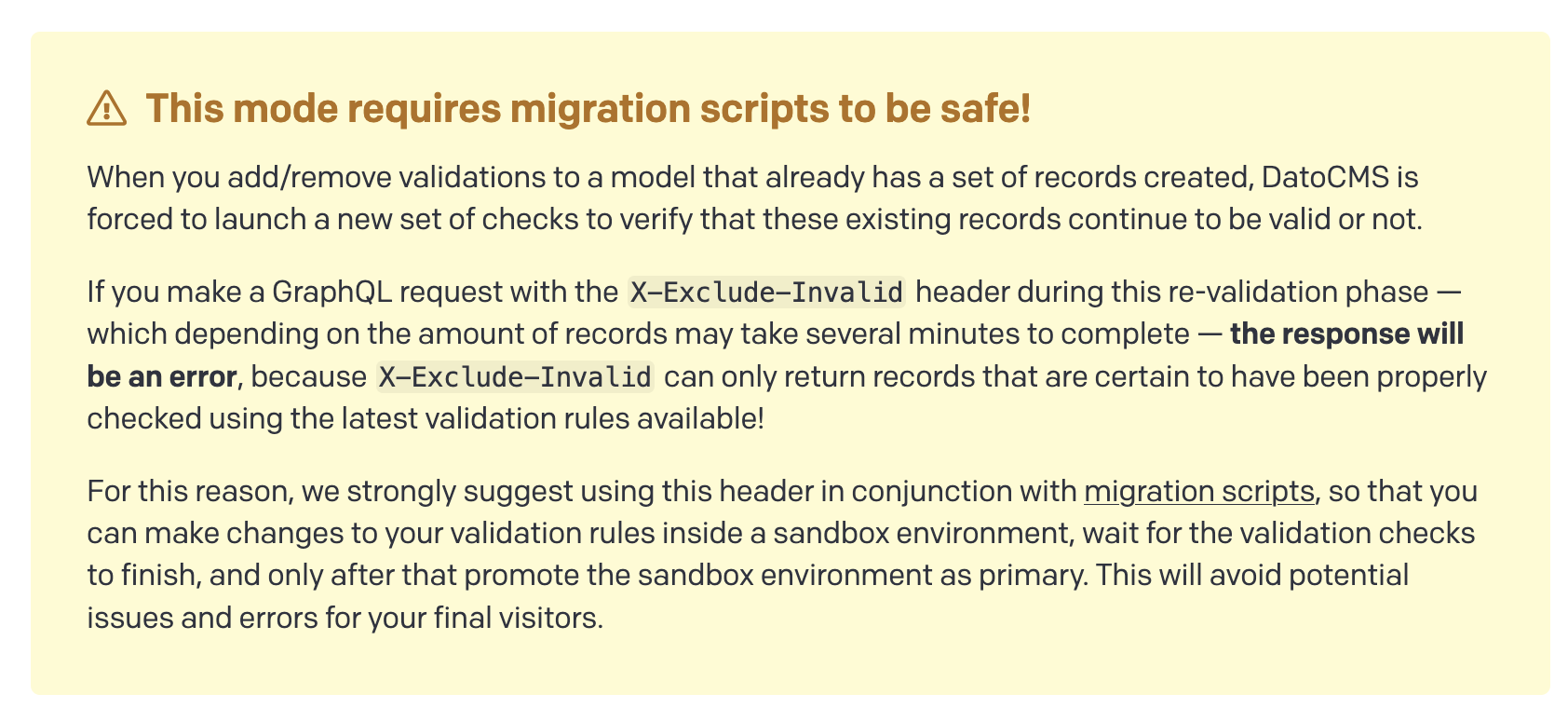 My question is: how are we supposed to modify a schema without bringing down queries that use X-Exclude-Invalid until all records are re-validated? Schema modifications are unavoidable in any project. It canāt be the case that every change results in failed queries until validation finishes.