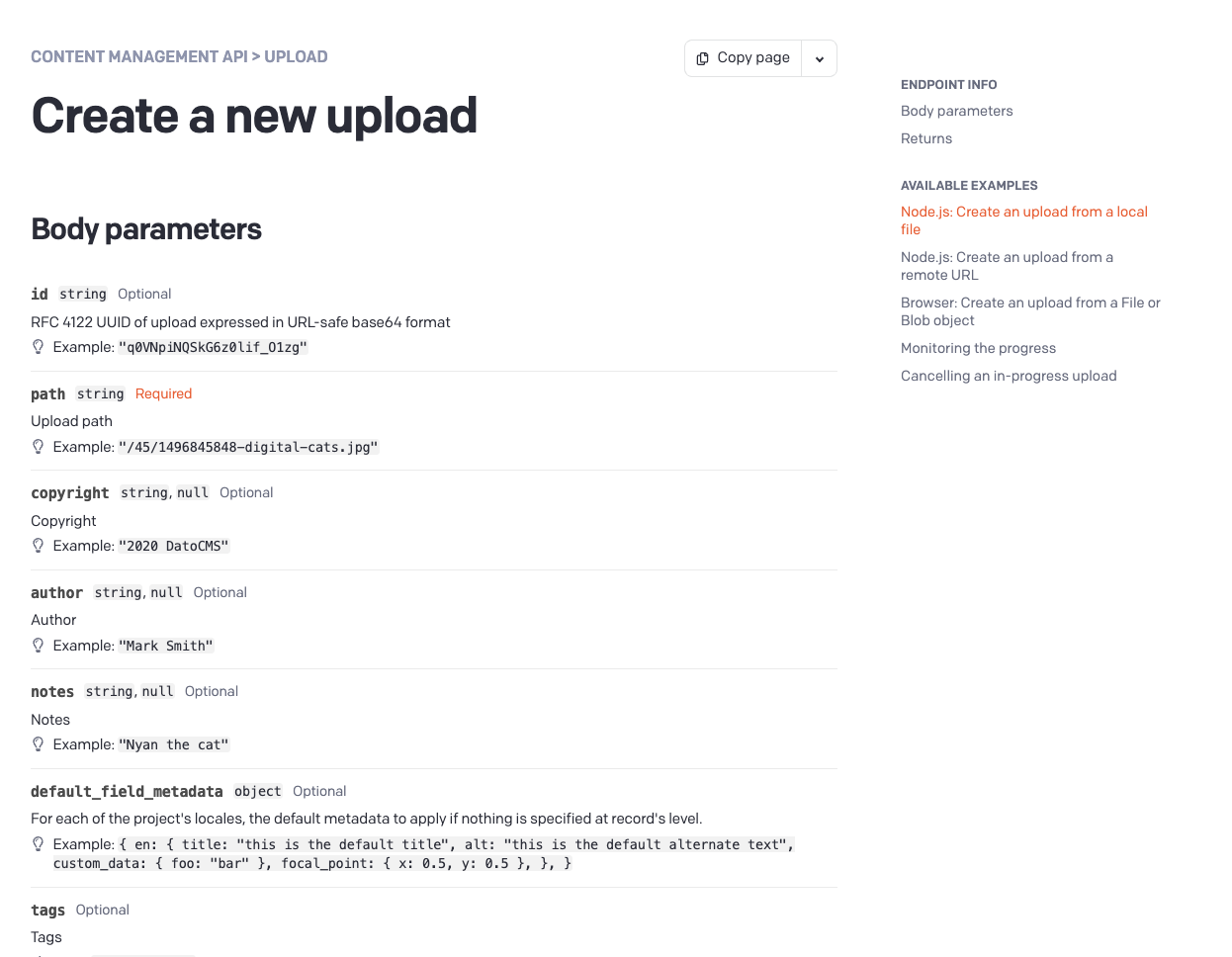 When I open the documentation for the upload functionality in the Content Management API there are multiple links to examples on the sidebar but they don’t lead anywhere. Can they be found somewhere?